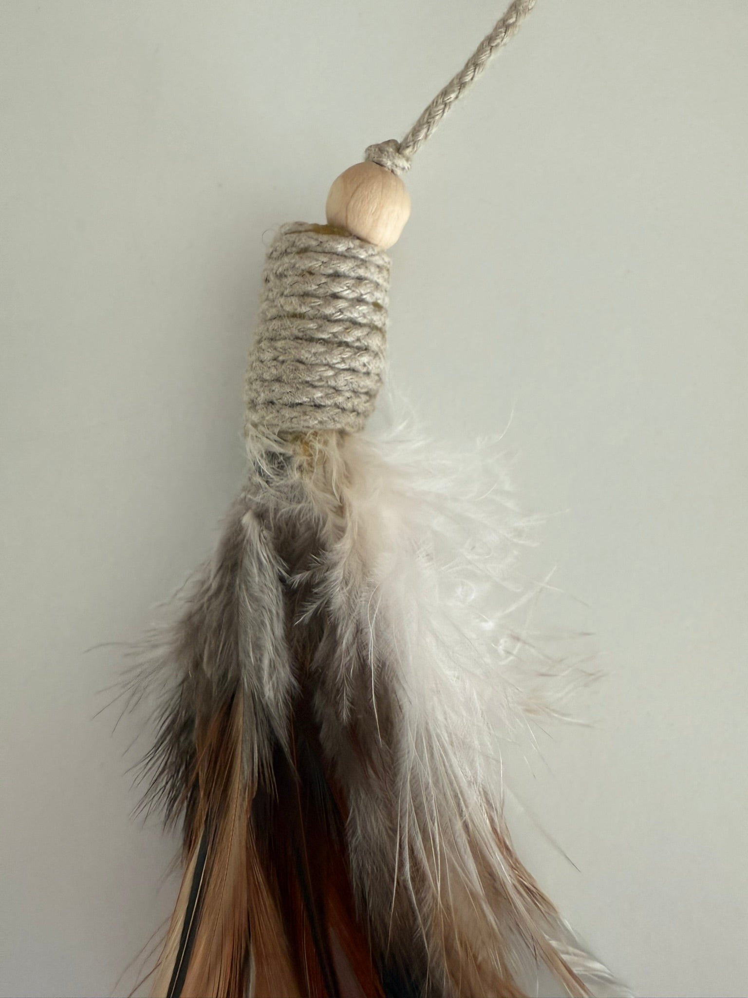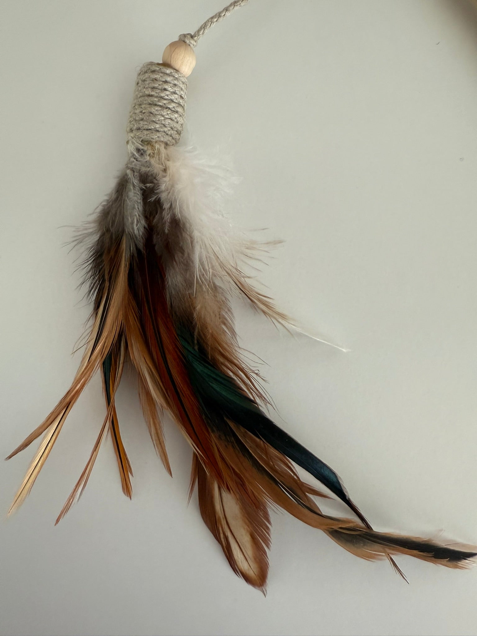 Material: Hanfgarn / Griff aus Buchenholz /Glocke aus Stahl / Federn in verschiedenen Größen und Farben